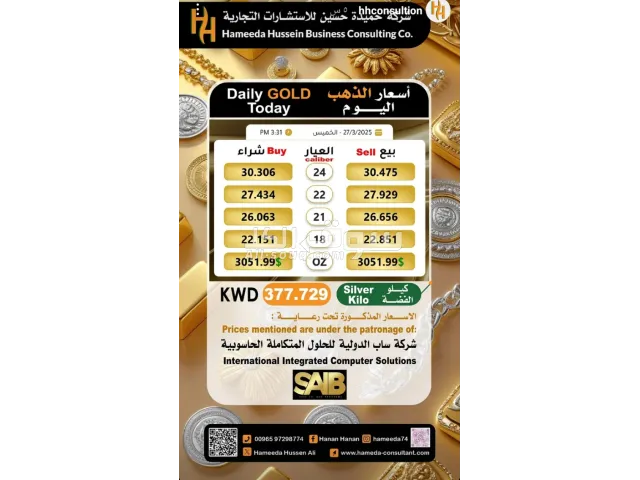 اسعار الذهب والفضة كل يوم بالكويت يتم الاعلان عنها من قبل شركة حميده حسين للاستشارات التجارية والاستثمار