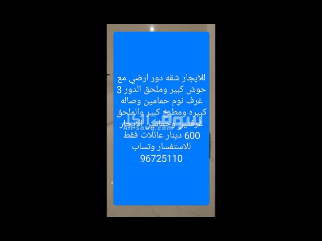 للايجار شقه دور ارضي مع حوش كبير وملحق الدور 3 غرف نوم حمامين وصاله كبيره ومطبخ كبير والملحق غرفتين وحمامين الايجار 600 دينار عائلات فقط للاستفسار وتساب 96725110