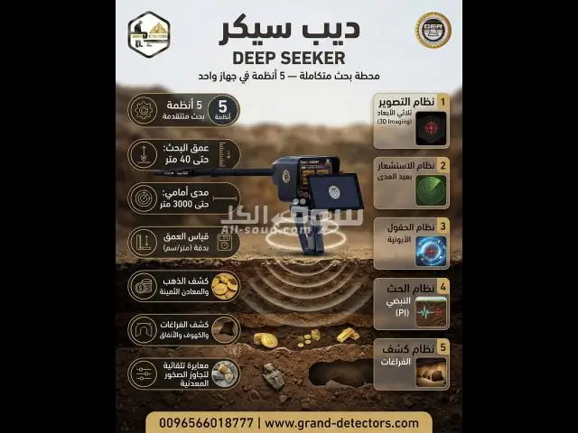 ديب سيكر: اكتشف الكنوز الخفية في باطن الأرض! مميزات جهاز ديب سيكر: - متخصص في الكشف عن الذهب والكنوز الدفينة والآثار القديمة. - يعمل في جميع أنواع التضاريس وفي أصعب الظروف المناخية. - يتجاوز جميع أنواع الصخور المعدنية بتقنية المعايرة الأتوماتيكية. الأنظمة الخمسة لجهاز ديب سيكر: نظام البحث عن الحقول الأيونية. نظام البحث عن المعادن المغناطيسية. نظام كشف الفراغ...